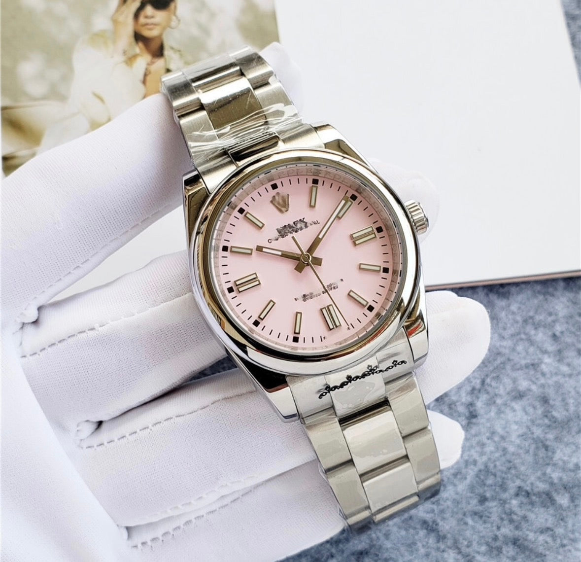 All watches logo are blurred for online store only.This watch features a stainless steel case and bracelet, offering a sleek, durable finish perfect for everyday wear. Powered by a precise Swiss movement, it ensures reliable time keeping. The bracelet includes a full set of links, allowing it to be easily adjusted to fit your wrist perfectly, combining comfort with timeless style.